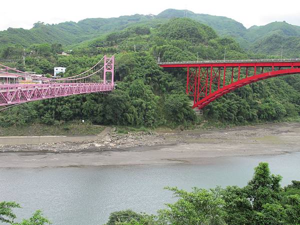 兩橋平行,鮮紅色的羅浮橋和粉紫色的復興橋,畫面上一拱一彎,相映交疊,一前一後掛在大漢溪上
